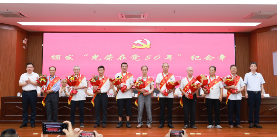 校党委书记贺祖斌,校党委副书记、校长孙杰远共同为2023年度“光荣在党50年”纪念章获得者颁发纪念章