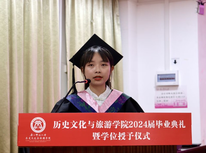 2024届硕士毕业生李金桂同学在发言中向学院师长们在求学生涯中的关心、教导表达了由衷感谢,她表示从师长们的言传身教中体会“立德、笃学、明理、修身”的院训精神,将带着母院期冀奔赴前方。2024届本科毕业生代表梁旭莹同学回顾了在四年在学院学习、生活的经历,她祝愿全体毕业生鹏程万里、未来可期。