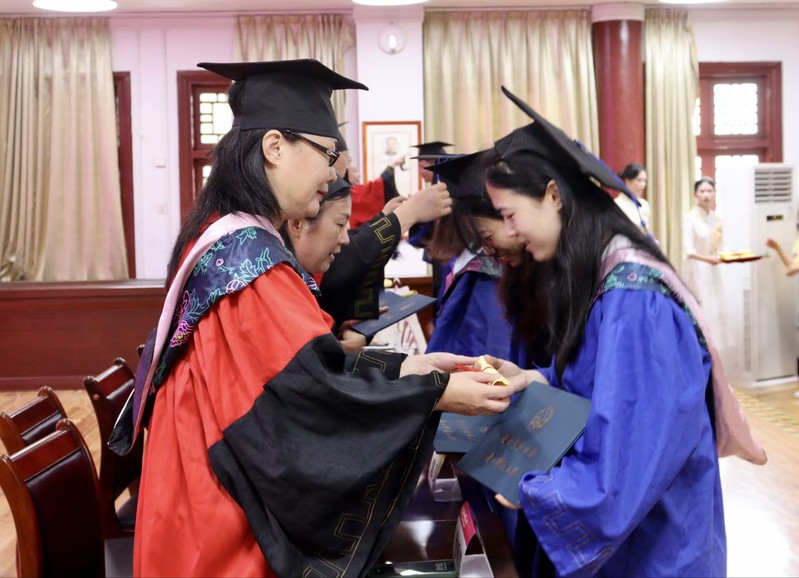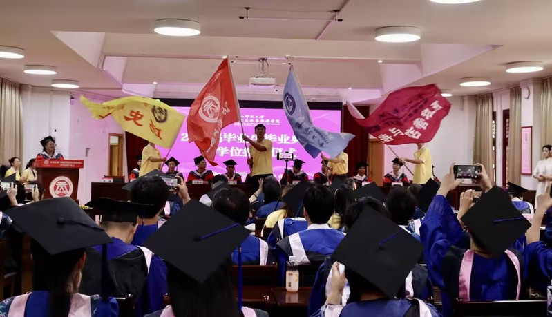 典礼最后进行环球360手机版登录2024届毕业生学位授予仪式,毕业生们有序上台,由学院领导、学位委员会委员为同学们依次拨穗、颁发毕业生学位证书。