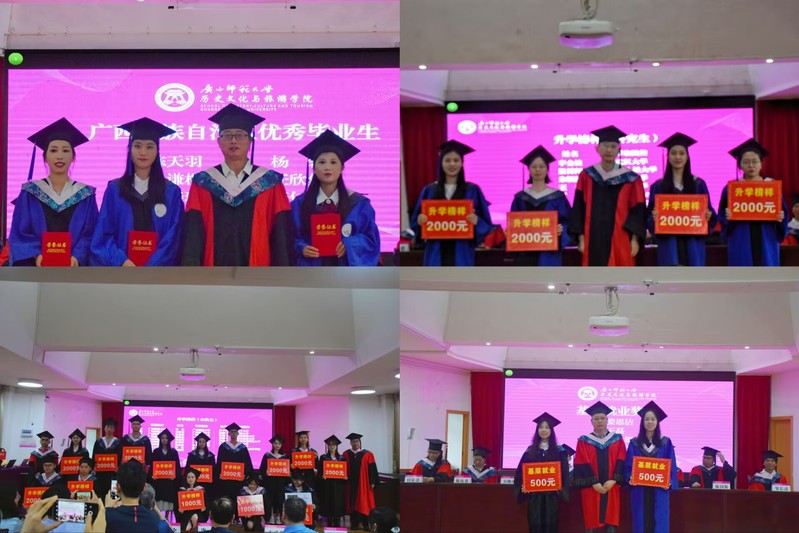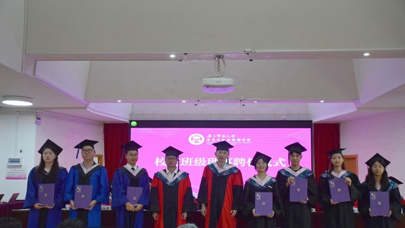 学院党委书记颜小华宣读了学院获得2024届广西普通高等教育优秀大学毕业生(简称“区优秀毕业生”)和2024届广西师范大学优秀毕业生名单,同时宣布了2024年学院升学奖励决定、基层就业奖励决定。在颁奖仪式上,由徐毅院长、颜小华书记、蓝武副院长、陈国保副院长、吴晓山副院长为区优秀毕业生,升学研究生、本科生及基层就业毕业生依次颁发证书及奖励。现场举行了校友班级理事聘任仪式,由颜小华书记、徐毅院长为理事代表们颁发聘书。