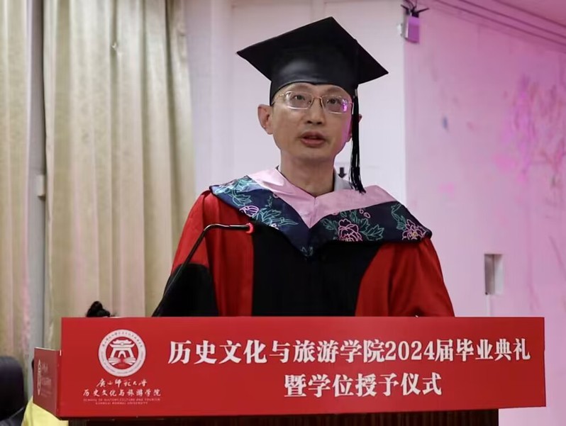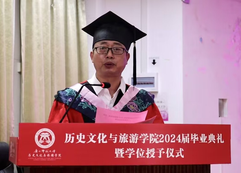 在悠扬的校歌声中,学生代表手持学院院旗、系旗开启了毕业典礼序幕,旗帜在风中飘扬,激发了在场毕业生们无限爱校荣院之情。徐毅院长进行大会致辞,徐老师首先向学院全体2024届毕业生表达了诚挚祝贺,并寄语毕业生:首先保持对历史文化的热爱和尊重,用知识与智慧去解读历史与文化的深层含义,去启迪未来的道路;其次要持续学习,不断创新,未来无论在任何岗位上都能够不断更新知识,掌握新技能,用创新的思维去解决工作中的问题,推动自身和行业的双向发展;再次要乐于奉献,为社会做出贡献,秉承文旅人敬业乐群的精神品格,奉献社会,让更多的人感受到历史文化的魅力。